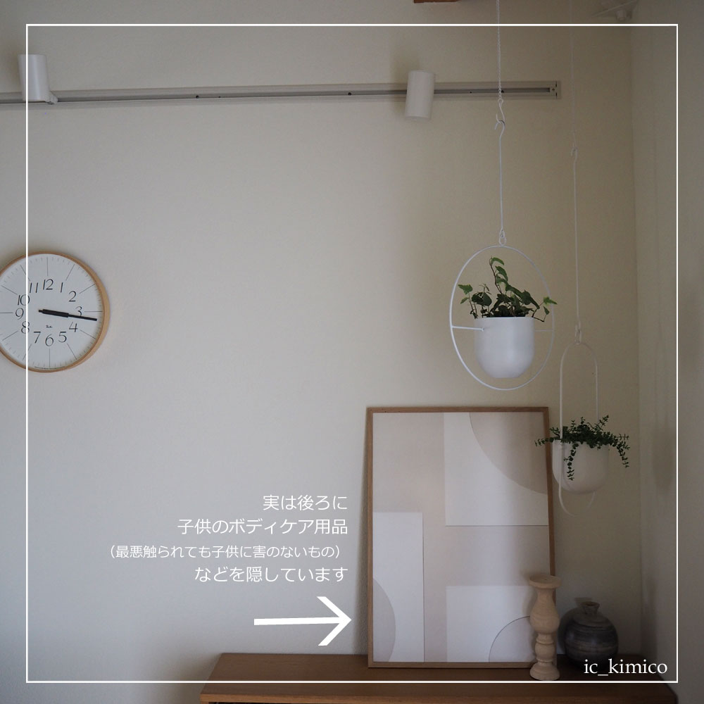 着替え時に使用する保湿クリームなどのお手入れグッズは、アートの後ろにできた隙間にこっそり置いています。
