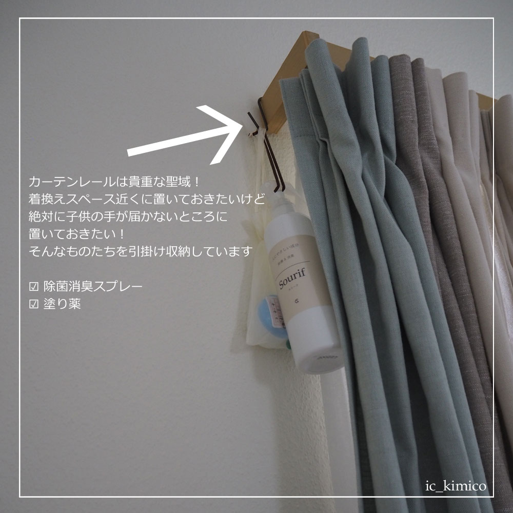 掃き出し窓のカーテンレールにS字フックを引掛けて、そこに引っ掛け収納することにしました。